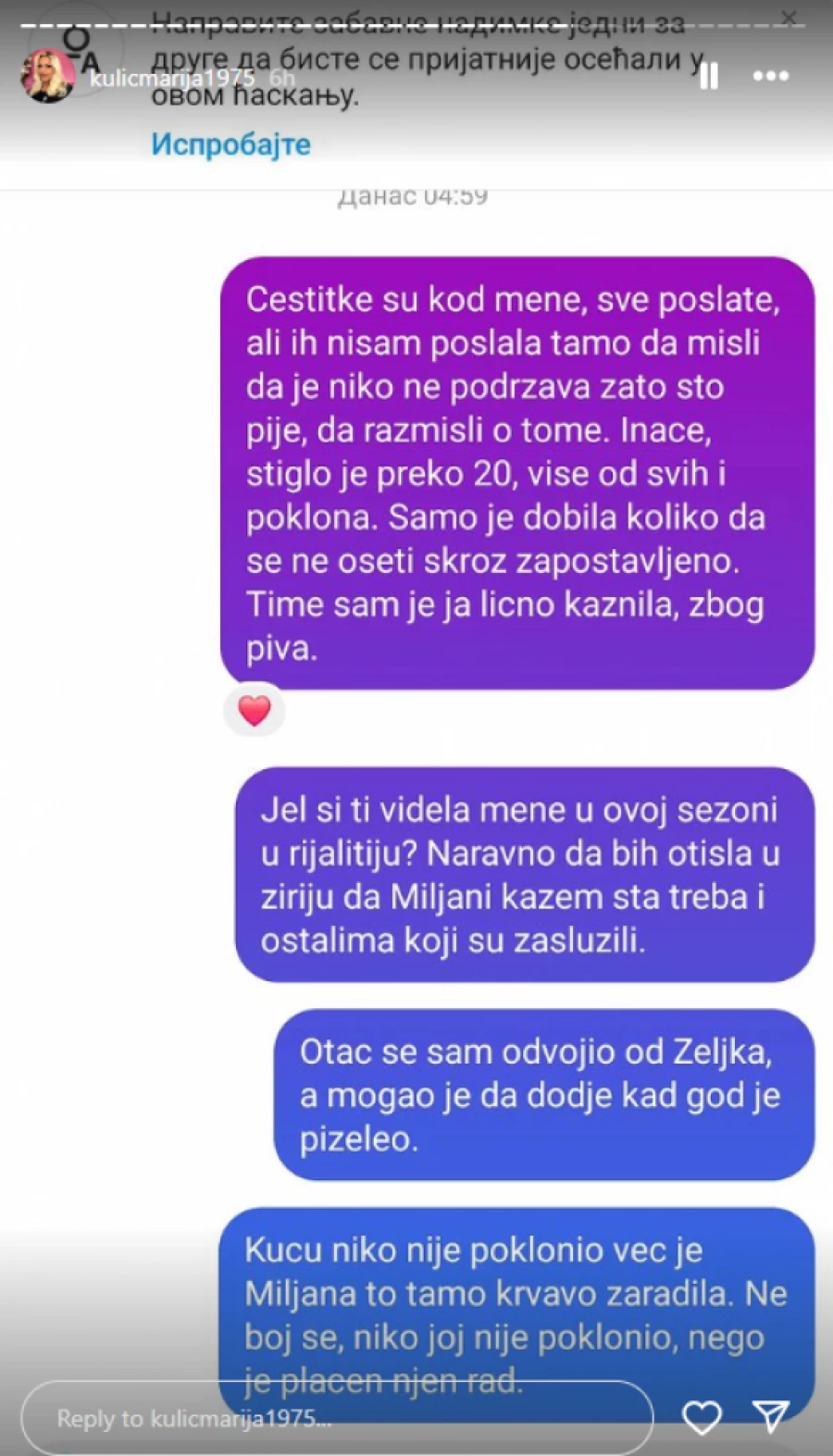 – Čestitke su kod mene, sve poslate, ali ih nisam poslala tamo, da misli da je niko ne podržava, zato što pije, da razmisli o tome. Inače, stiglo je preko 20, više od svih i poklona. Samo je dobila koliko da se ne oseti skroz zapostavljeno. Time sam je ja lično kaznila, zbog piva. Da li si ti mene videla u ovoj sezoni u rijalitiju? Naravno da bih otišla u žiri da Miljani kažem šta treba i ostalima koji su zaslužili. Otac se sam odvojio od Željka, a mogao je da dođe kad god je poželeo. Kuću niko nije poklonio već je Miljana to tamo krvavo zaradila. Ne boj se, niko joj nije polonio, nego je plaćen njen rad.