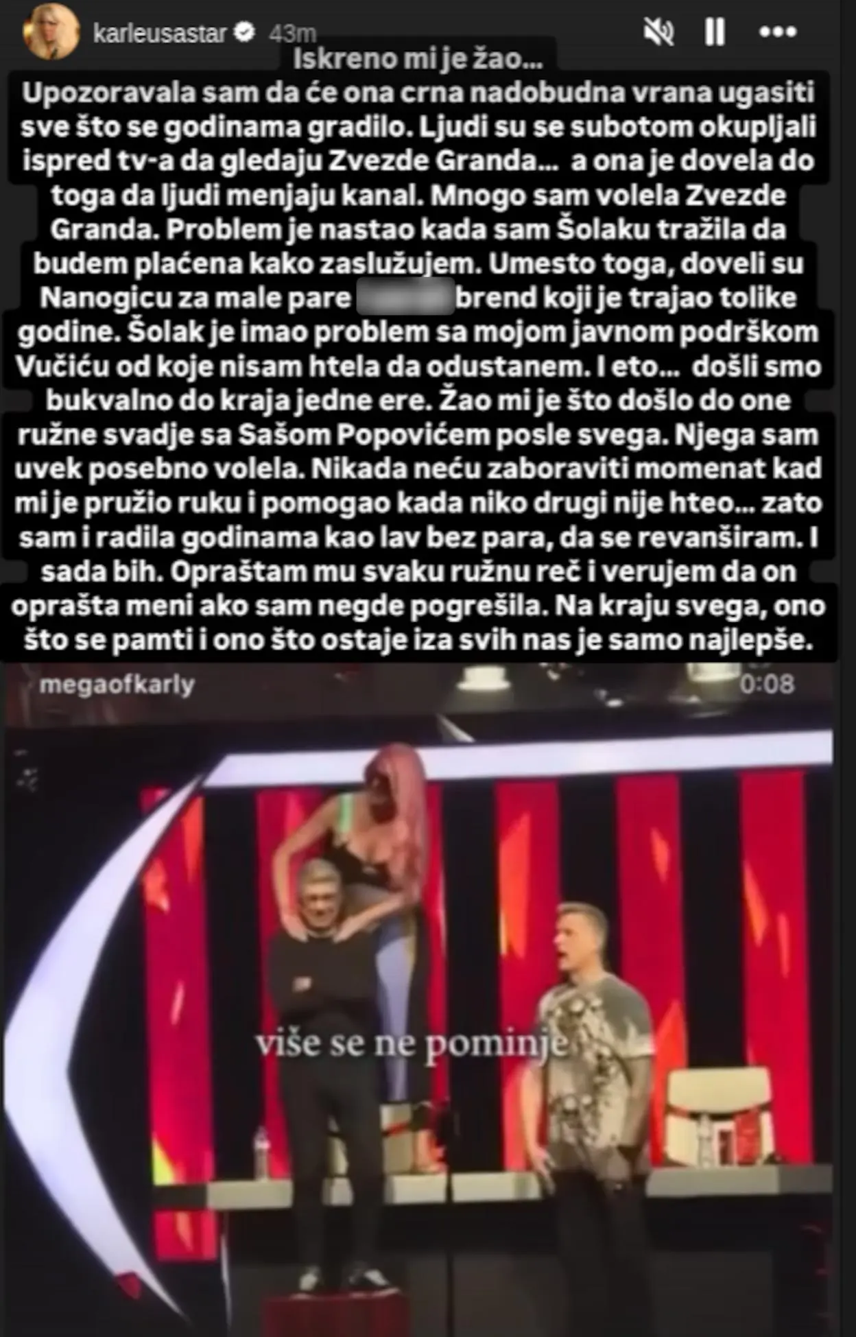 – Upozoravala sam da će ona nadobudna vrana ugasiti sve što se godinama gradilo. Ljudi su se subotom okupljali ispred TV-a da gledaju Zvezde Granda… a ona je dovela do toga da ljudi menjaju kanal. Mnogo sam volela Zvezde Granda. Problem je nastao kada sam Šolaku tražila da budem plaćena kako zaslužujem. Umesto toga, doveli su Nanogicu za male pare i u*rali brend koji je trajao tolike godine. Šolak je imao problem sa mojom javnom podrškom Vučiću od koje nisam htela da odustanem. I eto… došli smo bukvalno do kraja jedne ere – rekla je pop diva i dodala:
