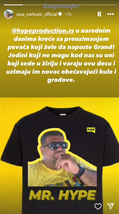 – Hypeproduction.rs u narednim danima kreće sa preuzimanjem pevača koji žele da napuste Grand. Jedini koji ne mogu kod nas su oni koji sede u žiriju i varaju ovu decu i uzimaju im novac obećavajući im kule i gradove – napisao je Mirković u svojoj objavi.