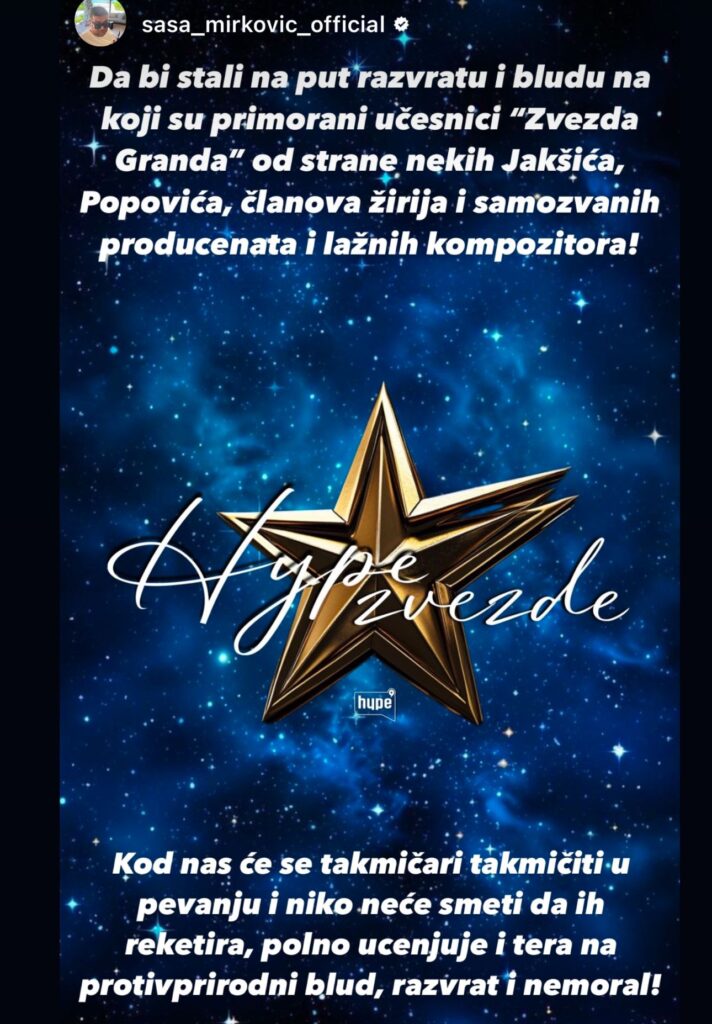 – Da bi stali na put razvratu i bludu na koji su primorani učesnici “Zvezda Granda” od strane nekih Jakšića, Popovića, članova žirija i samozvanih producenata i lažnih kompozitora! – kaže direktor Hype televizije i ističe: