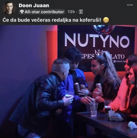 Stranica koja se bavi rijaliti aktuelnostima objavila je njihovu fotografiju tokom žurke, te su u opisu stavili: “Će da bude redaljka na koferuši”. Inače, mnogi kada vređaju Aneli nazivaju je “koferuša” s obzurom da je priznala da je kriminalcima preko granica prenosila novac u koferima.