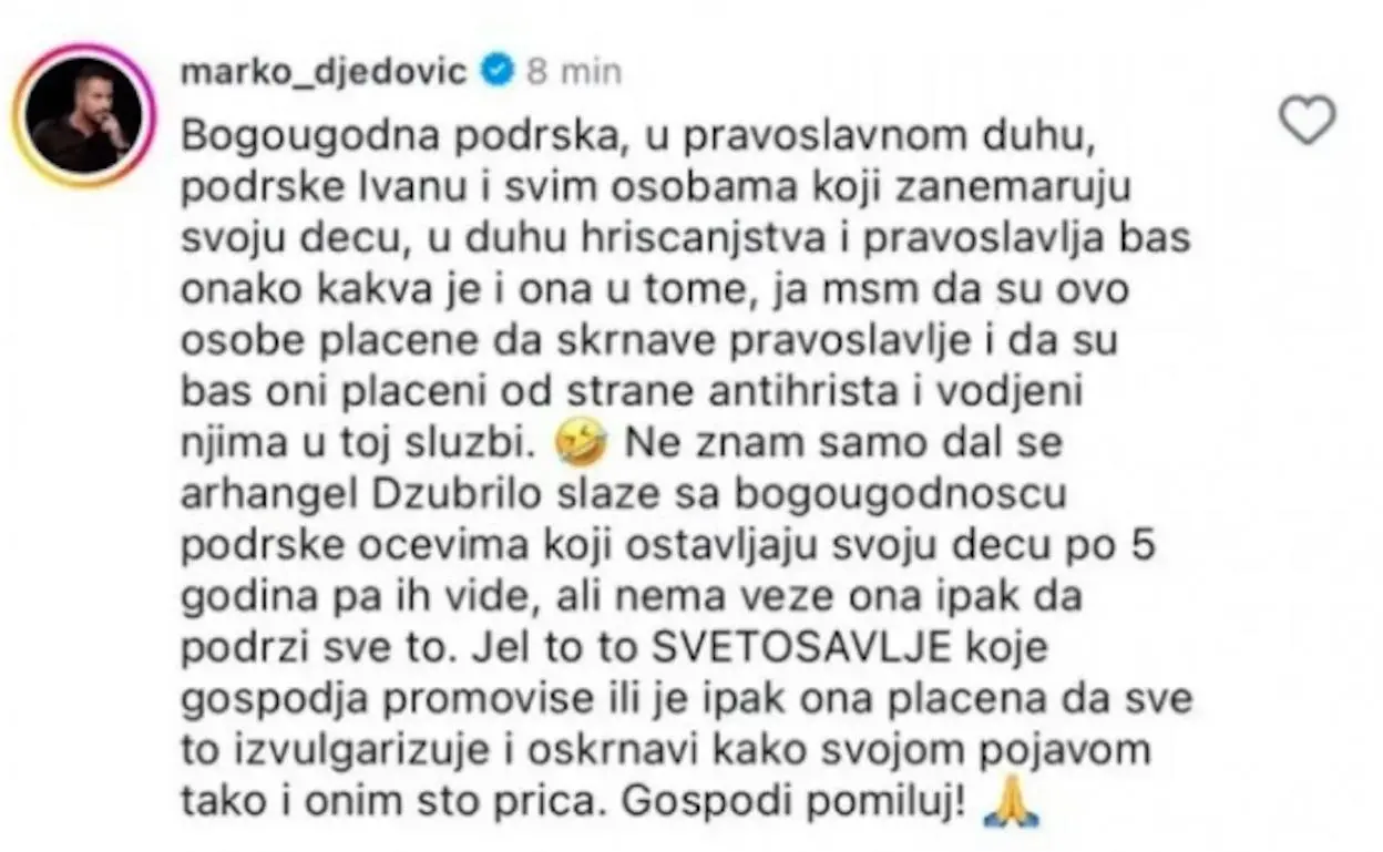 – Bogougodna podrška, u pravoslavnom duhu, podrške Ivanu i svim osobama koji zanemaruju svoju decu, u duhu hrišćanstva i pravoslavlja baš onako kakva je i ona u tome. Ja mislim da su ovo osobe plaćene da skrnave pravoslavlje i da su baš oni plaćeni od strane antihrista i vođeni njima u službi. Ne znam samo da li se arhangel Džubrilo slaže sa bogoudnošću podrške ocevima koji ostavljaju svoju decu po 5 godina pa ih vide, ali nema veze, ona ipak da podrži sve to. Je l’ to to svetoslavlje koje gospođa promoviše ili je ipak ona plaćena da sve to izvulgarizuje i oskrnavi, kako svojom pojavom, tako i onim što priča. Gospodi pomiluj – napisao je Đedović između ostalog na Instagramu.