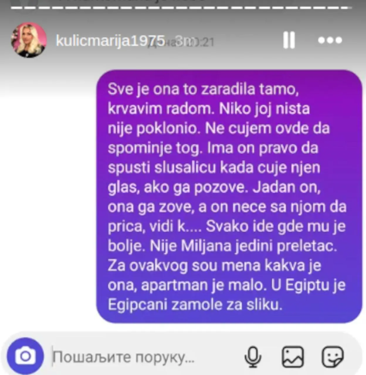 Sve je ona to zaradila tamo, krvavim radom. Niko joj ništa nije poklonio. Ne čujem ovde da spominje tog. Ima on pravo da spusti slušalicu kada čuje njen glas, ako ga pozove. Jadan on, ona ga zove, a on neće sa njom da priča, vidi k…. Svako ide gde mu je bolje. Nije Miljana jedini preletač. Za ovakvog šoumena kakva je ona, apartman je malo. U Egiptu je Egipćani zamole za sliku – napisala je Marija na Instagram storiju.