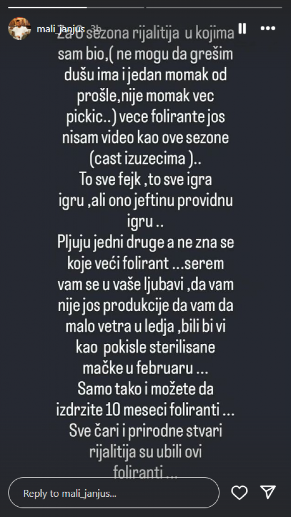 Međutim, Janjuš se nije zaustavio na tome, već je u novoj objavi sve aktuelne takmičare “Elite 8” nazvao folirantima, te ih isprozivao da su ubili sve čari i prirodne stvari rijalitija.