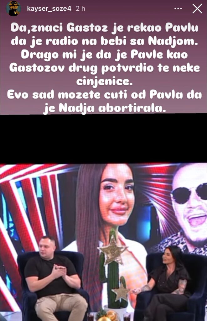 “Da, znači Gastoz je rekao Pavlu da je radio na bebi sa Nađom. Drago mi je da je Pavle kao Gastozov drug potvrdio te neke činjenice. Evo sad možete čuti od Pavla da je Nađa abortirala”., pisalo je u objavi na društvenoj mreži Instagram.