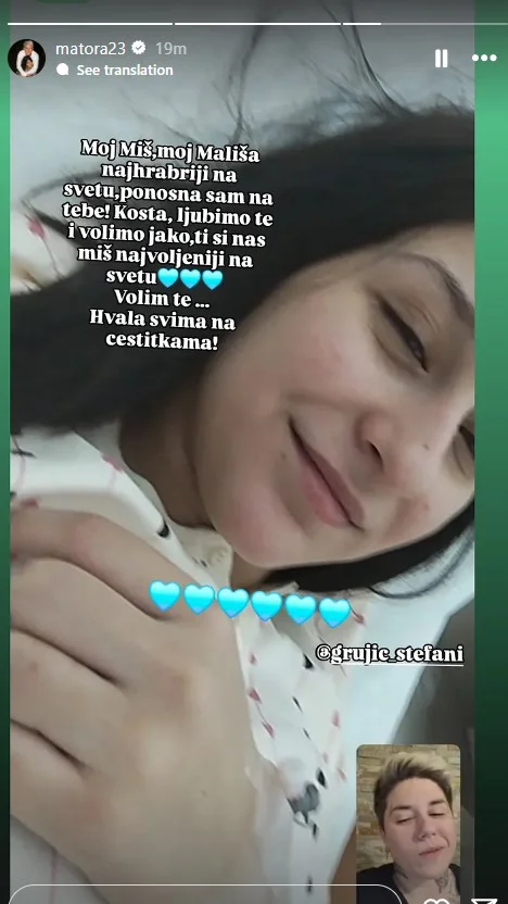 – Moj miš, moj mališa najhrabriji na svetu, ponosna sam na tebe! Kosta, ljubomo te i volimo jako, ti si naš miš najvoljeniji na svetu. Volim te! Hvala svima na čestitkama – napisala je Matora.