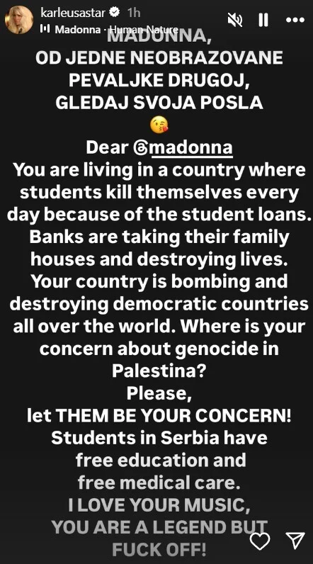 “Molim te, neka oni budu tvoja briga. Studenti u Srbiji imaju besplatno školovanje i besplatno liječenje. Volim tvoju muziku, legenda si, ali odje*i”, objavila je, a u opisu je dodala: “Ostavi moju zemlju na miru!”.