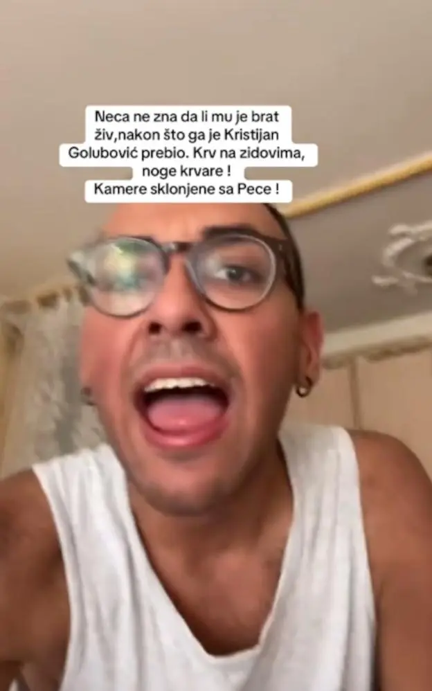 – Odmah, ali odmah, neka moj brat izađe napolje. Nemoj da ga maltretira ovaj i da ga gađa mesom. Gde je obezbeđenje? Povređena mu je noga. Ne mogu više ovo da gledam. Sad ću da vam j*bem mater svima ko digne ruku na mog brata. Šta je utripovao ovaj kriminalac, Kristijan Golubović. Ne sme niko ništa da mu kaže. Gde je moj brat? Gde je moj brat? Ja ne znam ništa o mom bratu. Sklonili su kadar. Što? Što ste sklonili kadar? Šta krijete? Pokažite kako nasilnik ubija ljude. Sad idem u policiju, kraj – vikao je Neca kroz suze i dodao: