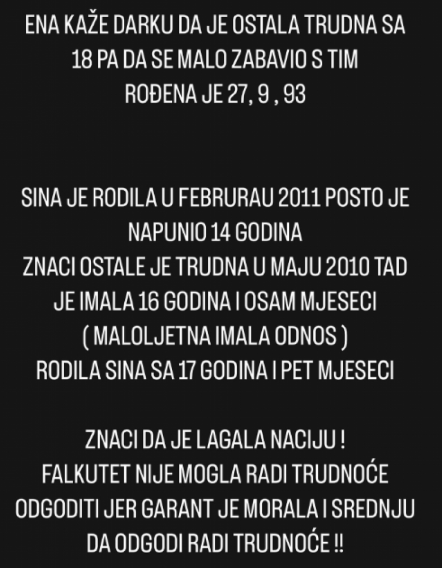 – Ena kaže Darku da je ostala trudna sa 18, pa da se malo pozabavimo time. Rođena je 27.09.1993. Sina je rodila u februaru 2011, pošto je napunio 14 godina (kako stoji u izjavi ujka). Znači, ostala je trudna u maju 2010., tada je imala 16 godina i osam meseci (maloletna je imala odnos). Rodila je sina sa 17 godina i pet meseci. Znači da je lagala naciju! Fakultet nije mogla radi trudnće da odgodi, jer je onda morala i srednju radi trudnoće – stajalo je u objavi koja je podigla pravu buru na mrežama.