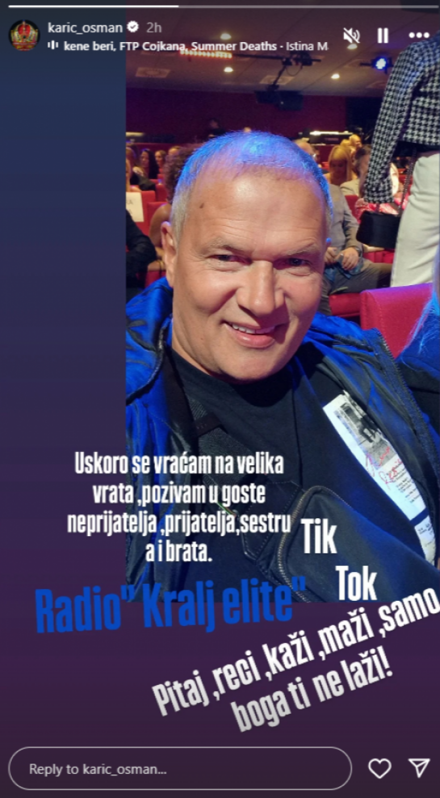Osman Karić, otac popularnog rijaliti učesnika Stefana Karića, izazvao je pravu pometnju u rijaliti svetu kada je putem svoje Instagram stranice podelio misterioznu objavu koja je zbunila sve njegove pratioce i fanove. Njegov post, koji je pratila fotografija, izazvao je brojne spekulacije i postavio mnoga pitanja među ljubiteljima rijalitija. U objavi je stajalo: “Uskoro se vraćam na velika vrata, pozivam u goste neprijatelja, prijatelja, sestru a i brata. Tik Tok. Pitaj, reci, kaži, maži, samo Boga ti ne laži! Radio ‘kralj Elite’.”