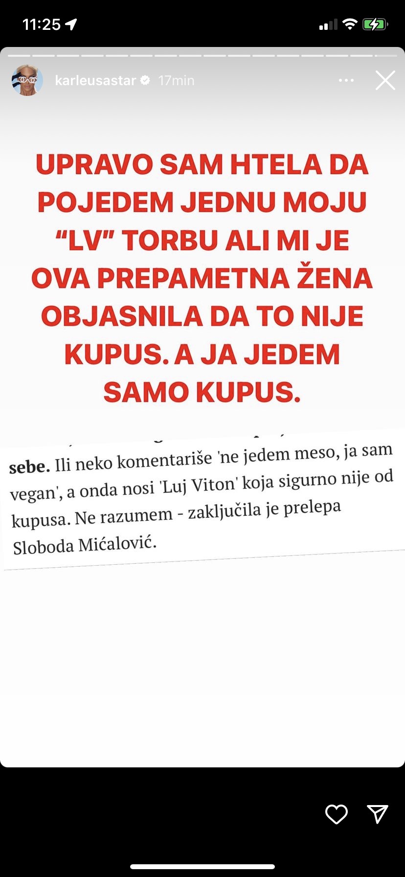 „Upravo sam htela da pojedem jednu moju ‘LV’ torbu, ali mi je ova prepamenta žena objasnila da to nije kupus. A ja jedem samo kupus“, napisala je Karleuša uz sliku.