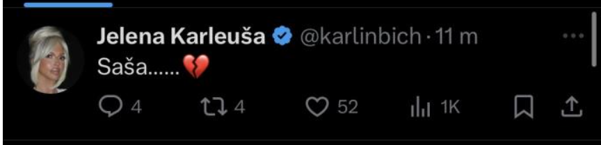 Jelena Karleuša je se hitno oglasila na društvenoj mreži “X” stavivši slomljeno srce uz ime Saša.
