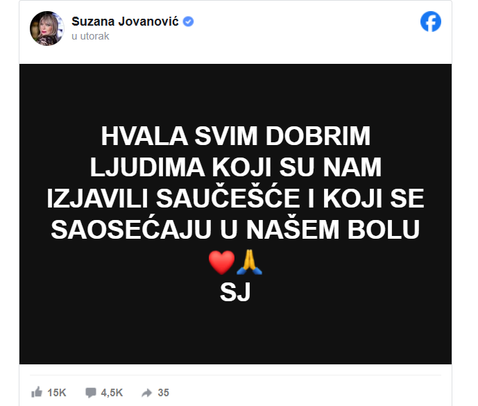 – Hvala svim dobrim ljudima koji su nam izjavili saučešće i koji se saosećaju u našem bolu – glasila je objava Suzane Jovanović na društvenim mrežama, a ispod objave su se ređali komentari podrške, izrazi saučešća i reči utehe za porodicu koja se suočava s nenadoknadivim gubitkom.
