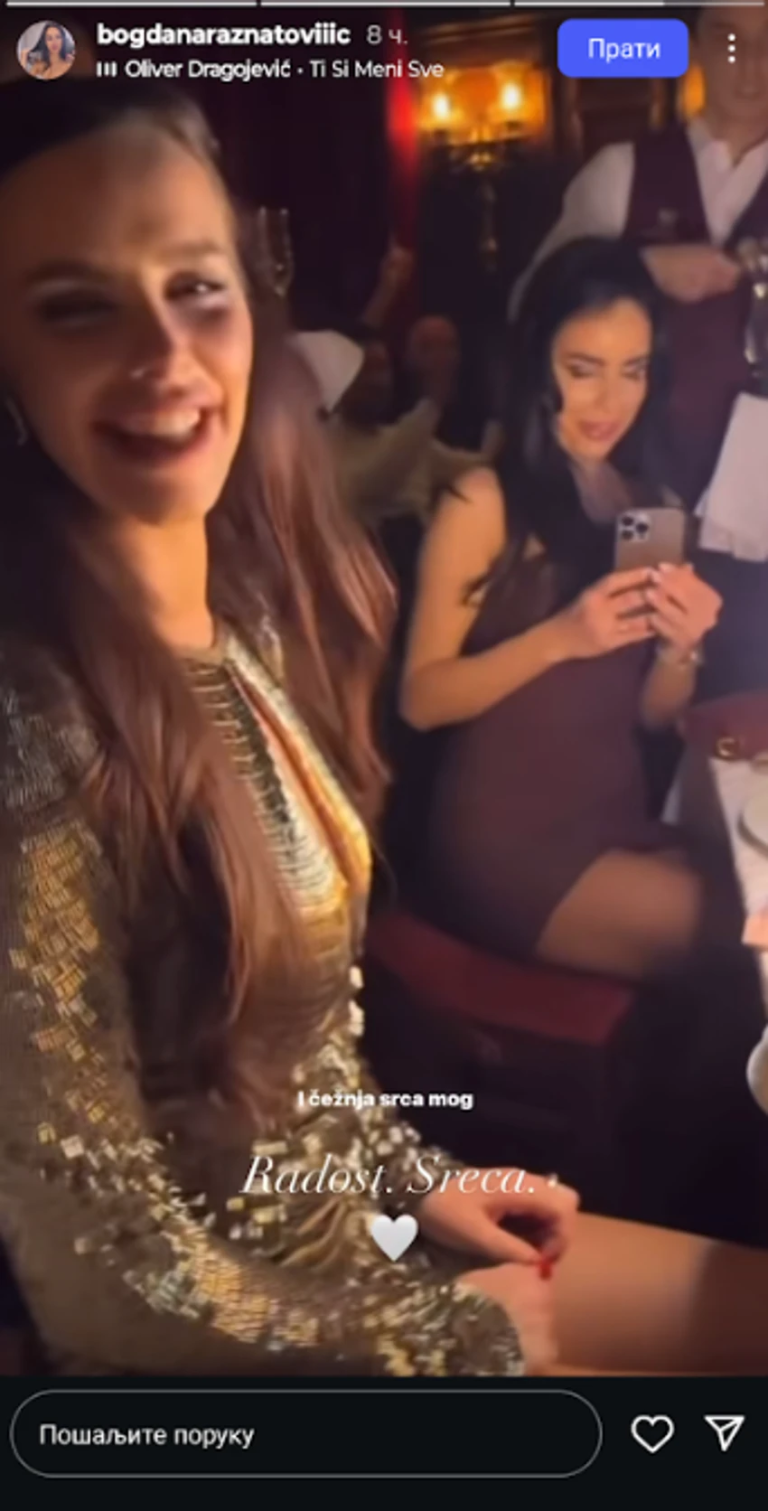 Bogdana je svoj poseban dan dočekala u veseloj atmosferi, uživajući u provodu sa drugaricama. Tačno u ponoć, na scenu je stupila raskošna torta sa vatrometom, a slavljenica je sve vreme blistala u elegantnoj zlatnoj haljini koja je istakla njene vitke noge i figuru. Osmeh nije silazio s njenog lica, a dobro raspoloženje prenelo se i na sve prisutne.