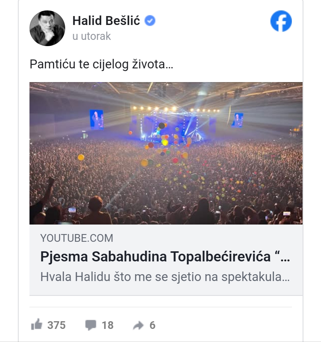 Ovaj glazbeni gigant, čije su pjesme desetljećima u srcima milijuna, podijelio je snimku svog nastupa na spektakularnom koncertu u Sarajevu, gdje je izvodio pjesmu “Pamtiću te” koju je izvorno izvodio Sabahudin Topalbećirević.