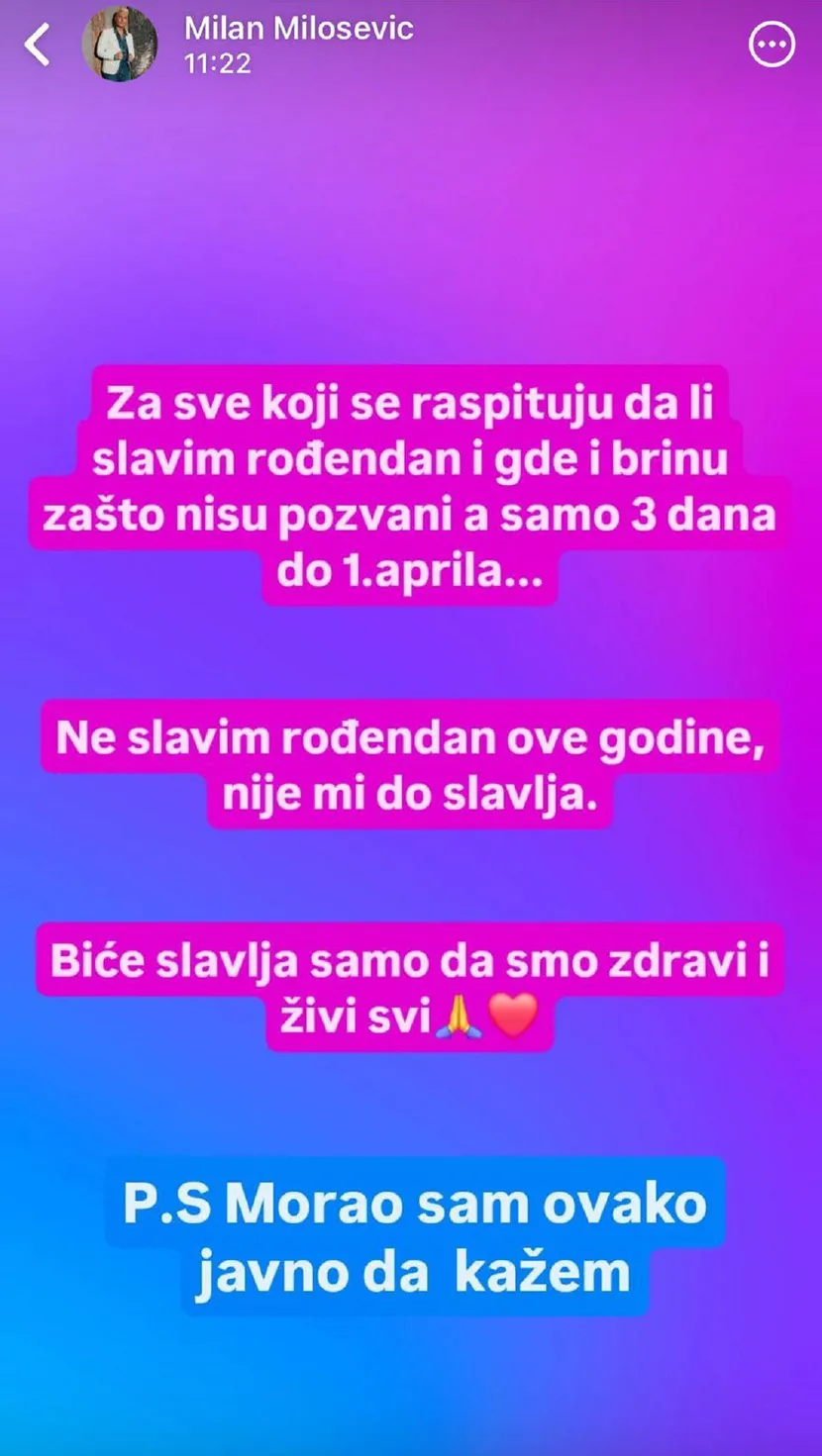 – Biće slavlja samo da smo zdravi i živi svi. Morao sam i ovako javno da kažem – poručio je Milan Milošević putem objave na storiju.