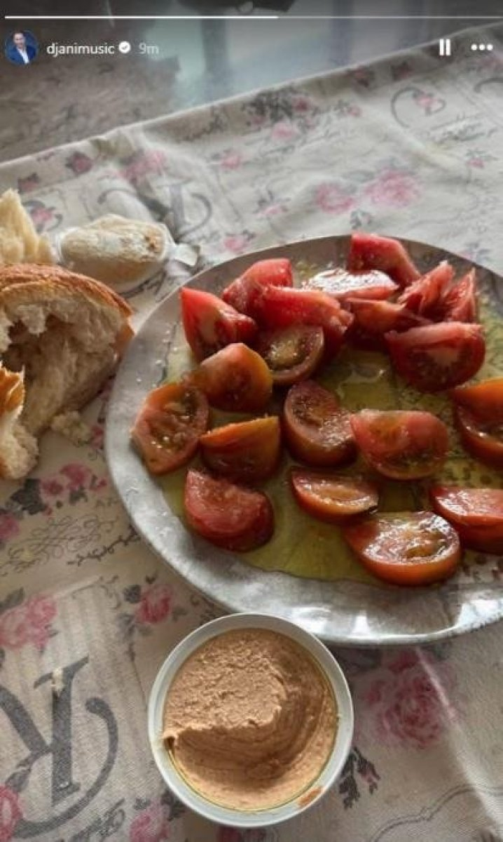 Na stolu su se našli domaći hleb, koji je Đani samo “iskopao” i pojeo sredinu, pašteta i paradajz prelivene maslinovim uljem.