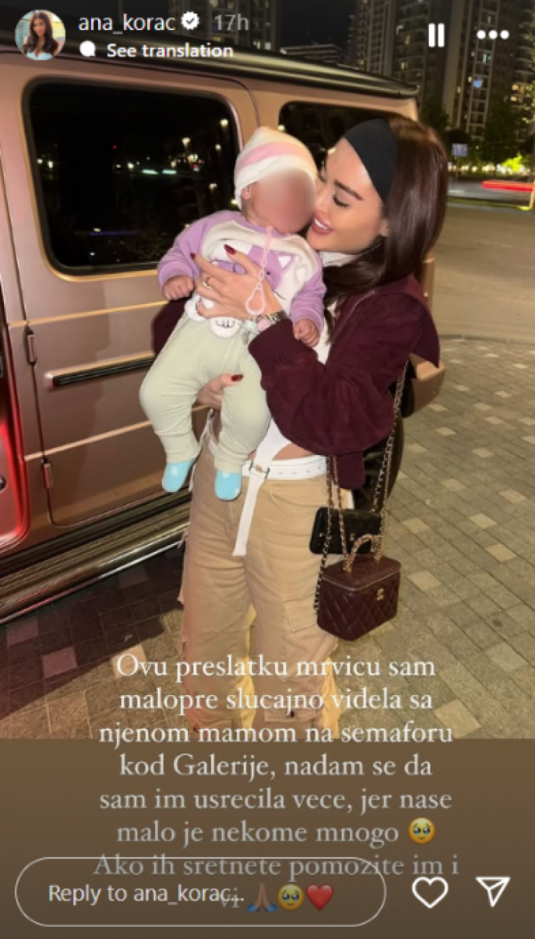 Ovu preslatku mrvicu sam malopre slučajno videla sa njenom mamom na semaforu kod tržnog centra, nadam se da sam im ulepšala veče, jer naše malo je nekome mnogo. Ako ih sretnete, pomozite im i vi – napisala je Ana Korać i dodala: