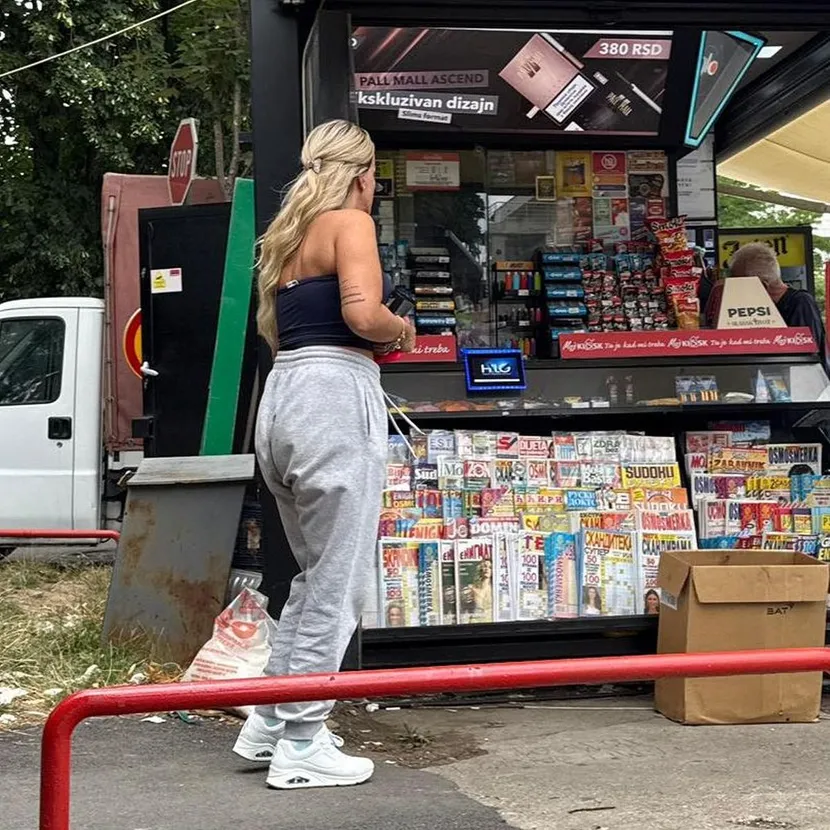Ona je uslikana ispred trafike preko puta Pinkove zgrade na Dedinju, a zatim i kako ulazi u nju.