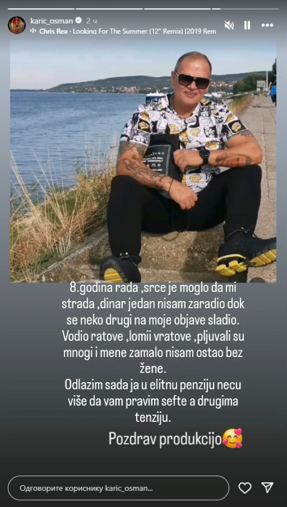 Osma godina rada, srce je moglo da mi strada, dinar jedan nisam zaradio dok se neko drugi na moje objave sladIo. Vodio ratove, lomili vratove, pljuvali su mnogi, i mene zamalo nisam ostao i bez žene. Odlazim sad u elitnu penziju, neću više da vam pravim sefte, a drugima tenziju. Pozdrav, produkcijo – napisao je Osman.
