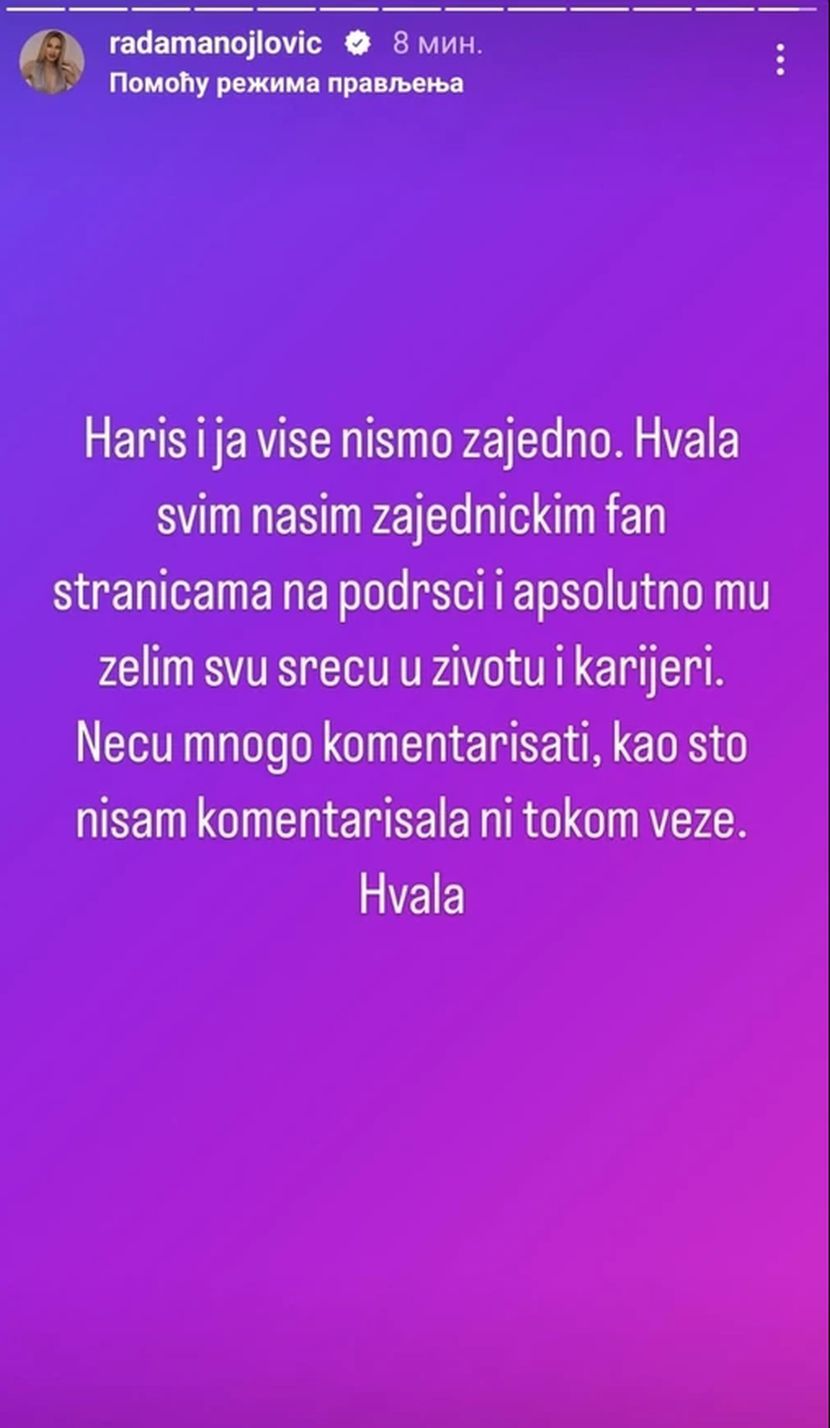 – Haris i ja više nismo zajedno – napisala je Rada večeras na svom Instagram profilu.