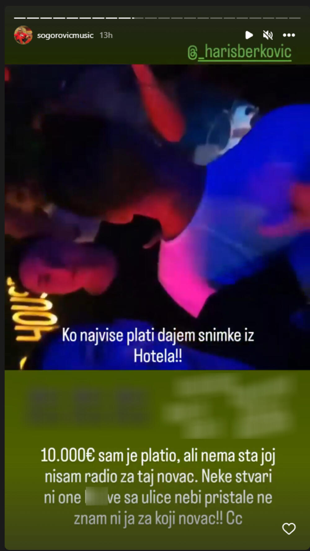 – Ko najviše plati, dajem snimak iz hotela. 10.000 evra sam je platio, ali nema šta joj nisam radio za taj novac – navodno je napisao između ostalog Šorogović.