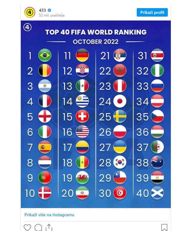 Što se tiče reprezentacija regiona, Hrvatska je najbolje plasirana na sjajnoj 12. poziciji, dok je Srbija na 21. mjestu.