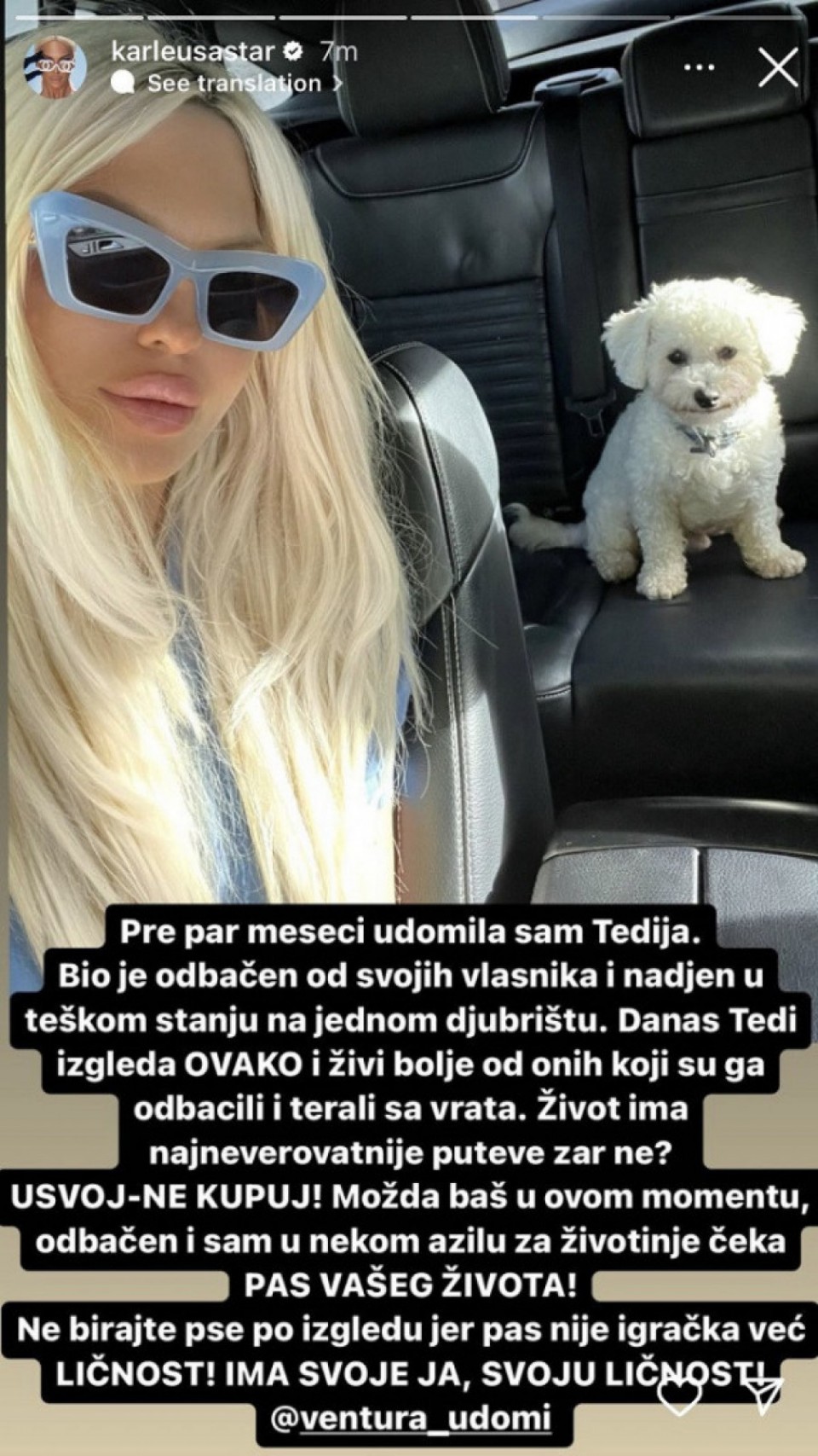 – Bio je odbačen, izbačen na ulicu, nađen u teškom stanju na deponiji u raspaloj fotelji. Dobri ljudi su ga spasili i objavili slike, ošišali, okupali, liječili kod veterinara. Onda se javila jedna čudna plava žena sa željom da ga usvoji. I nečiji život se od današnjeg dana pretvara u bajku – poručila je tada Karleuša.