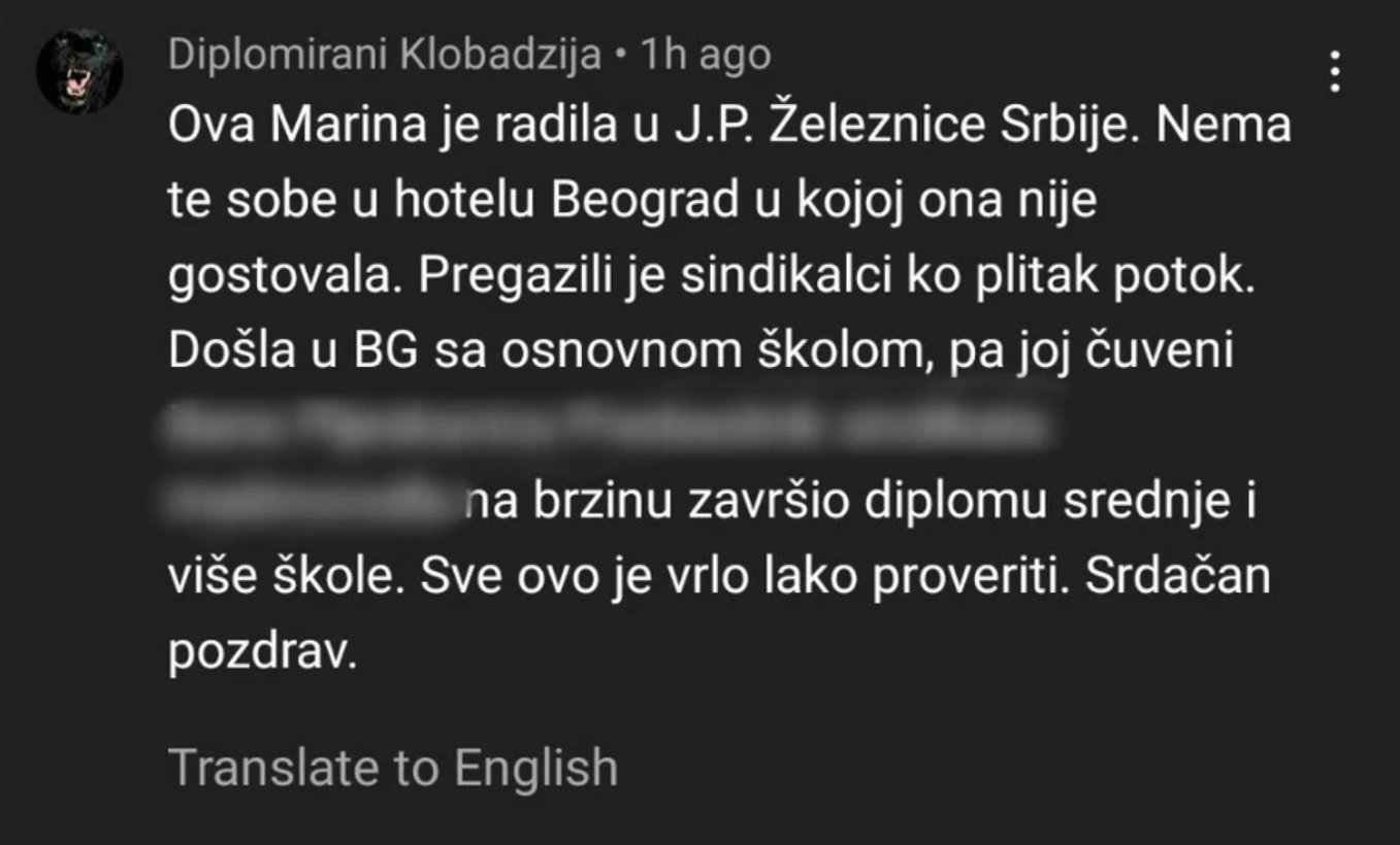 Ova Marina je radila u Železnici Srbije. Nema te sobe u hotelu Beograd u kojoj ona nije gostovala. Pregazili je sindikalci kao plitak potok. Došla u Beograd sa osnovnom školom, pa joj na brzinu završili diplomu srednje i više škole. Sve ovo je lako proverljivo – pisalo je u tvitu, ali ni to nije bilo to: